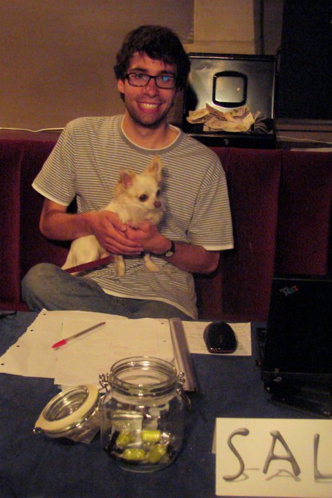Here’s a photo of John on the box office with a small dog – probably before having to announce a show with a name like “Penetrator” in the Fringe Bar…
